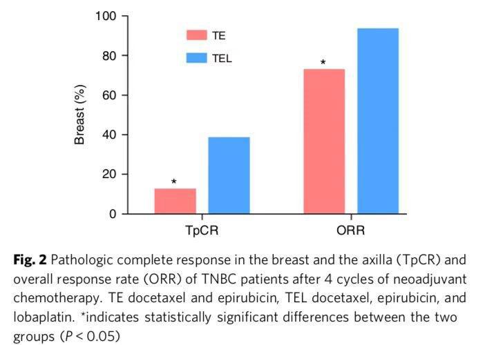 研究結(jié)果顯示:多西他賽和表柔比星方案中加入洛鉑作為T(mén)NBC的新輔助化療方案與多西他賽和表柔比星方案相比高顯著提高了TpCR率和ORR,毒性可以耐受; 短期來(lái)看還可以減少?gòu)?fù)發(fā)和轉(zhuǎn)移率。